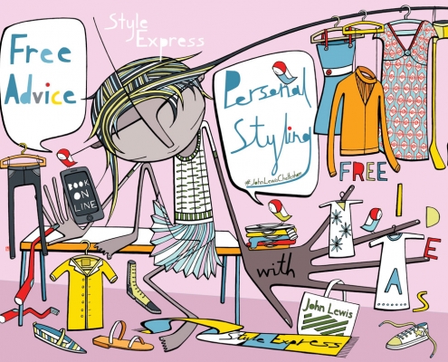 Hand drawn illustration, retaining an honest craftsmanship notwithstanding the photoshop and printing process, to represent the human touch, professionalism, care and attention so important to the John Lewis in-store shopping experience.