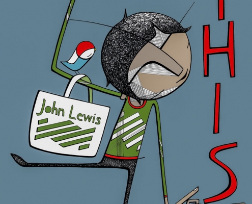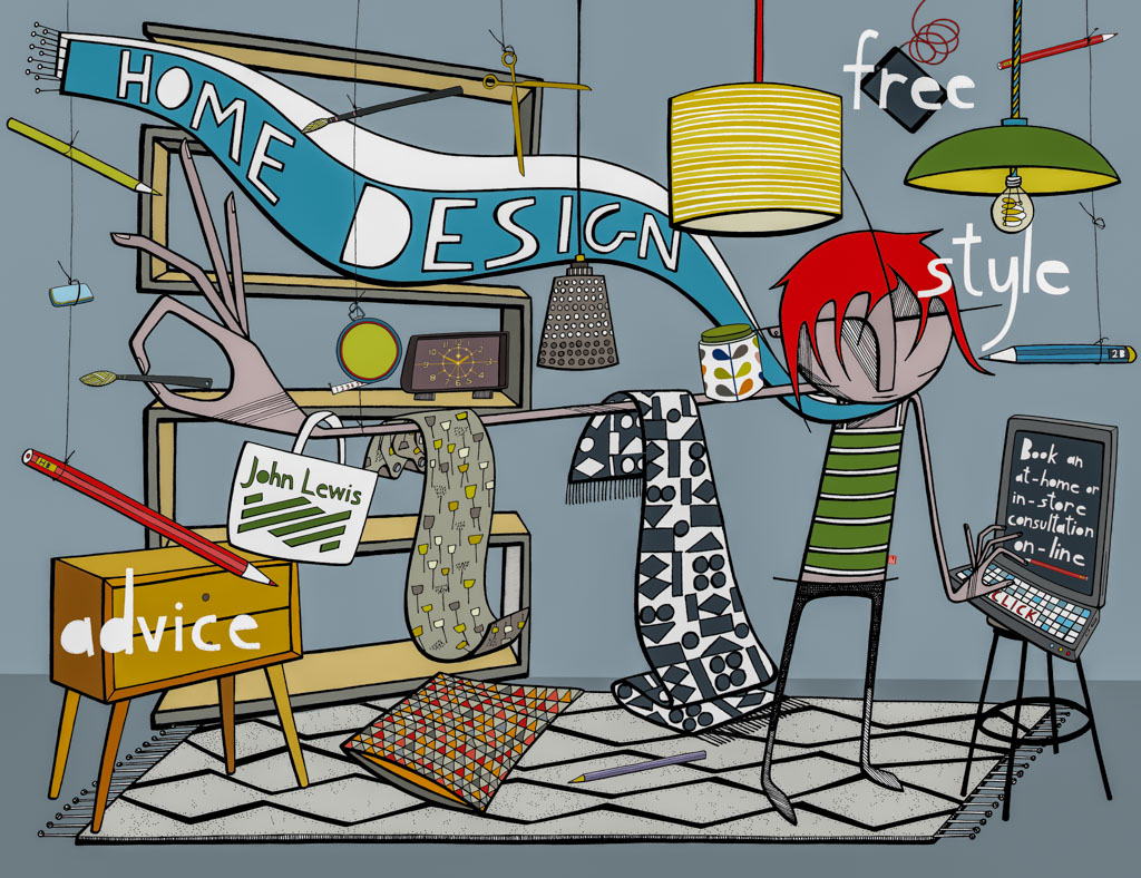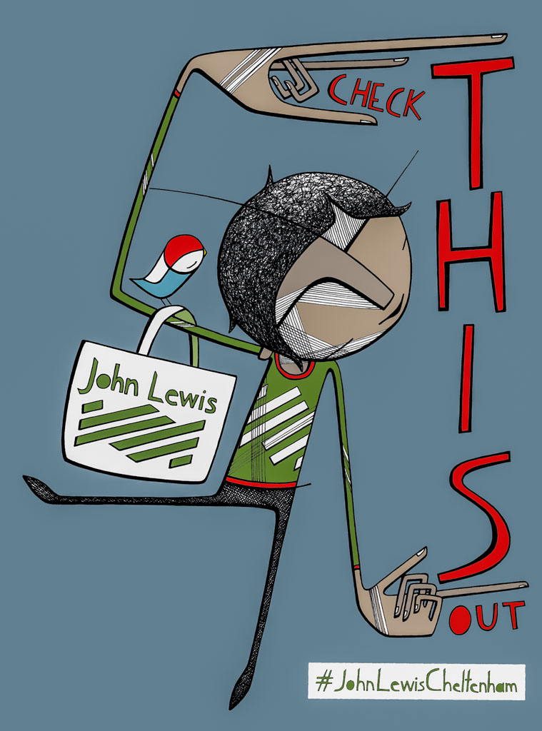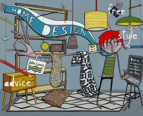 My challenge was to capture the John Lewis ethos and style, and to reinterpret that with an eye catching out of the ordinary twist incorporating my own drawing approach. My signature characters intermingle with product placements, text and full colour design. Each panel was conceived to stand alone but also to work in combination with a visual narrative and balance of composition and colour flowing from one to the next.