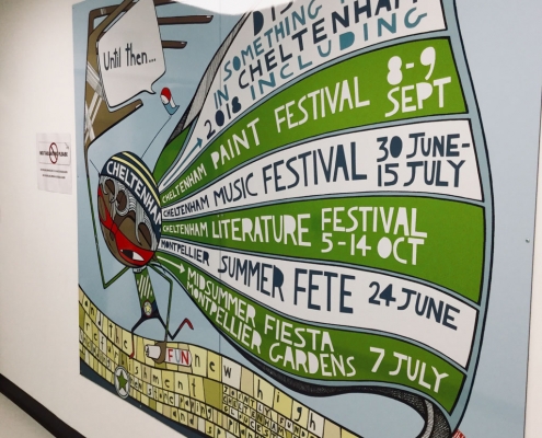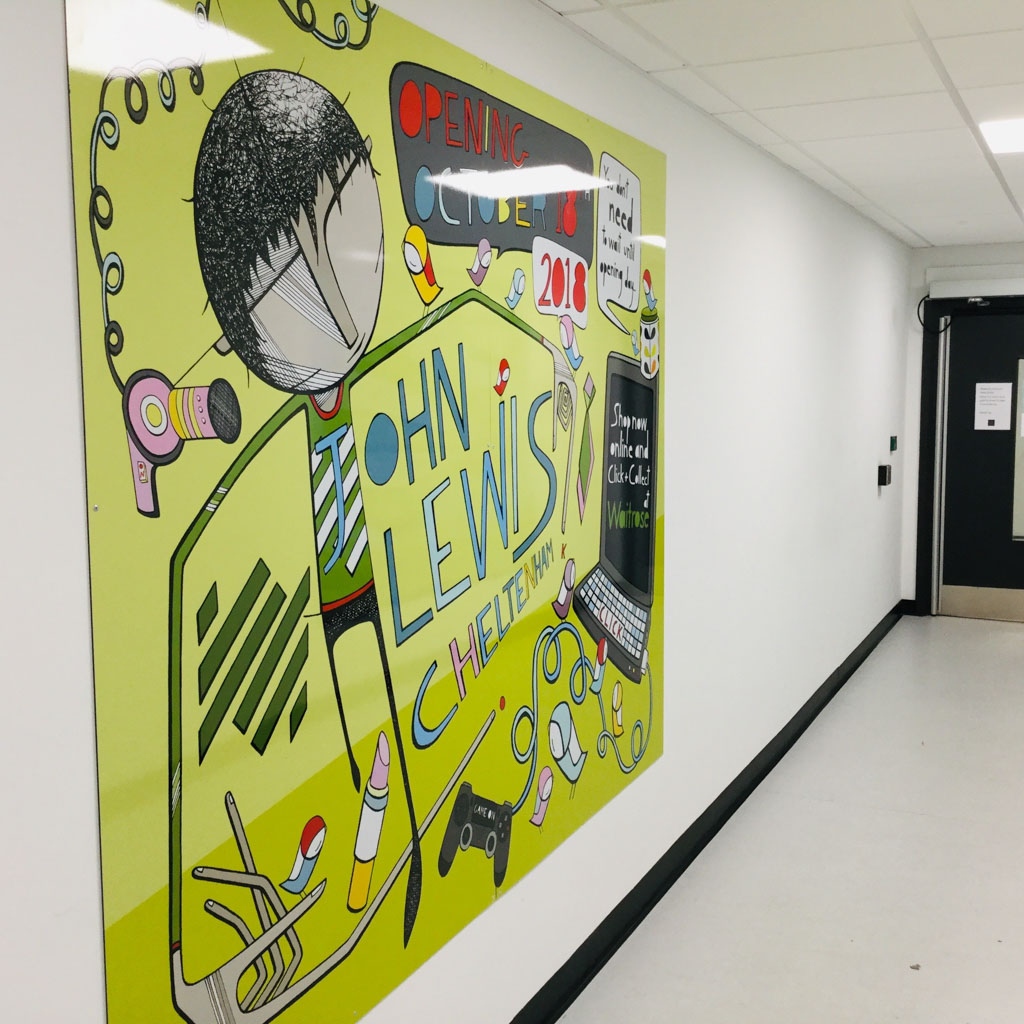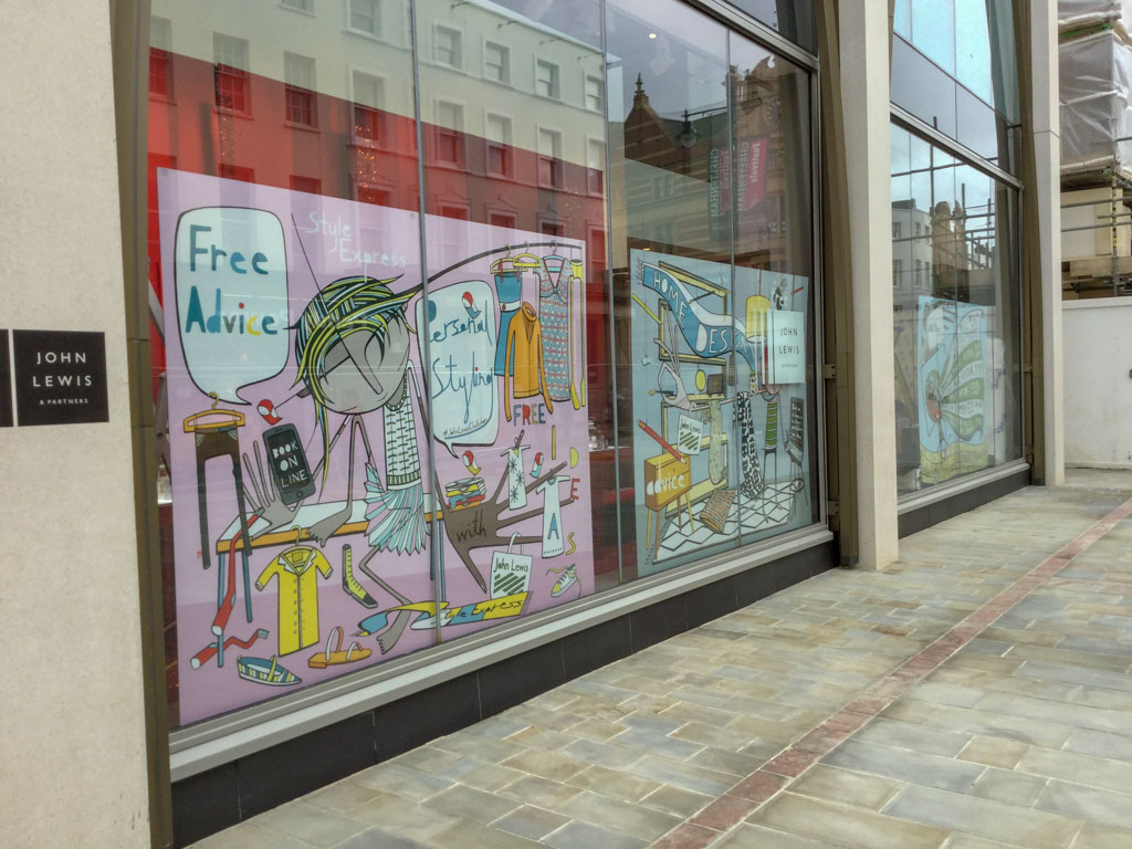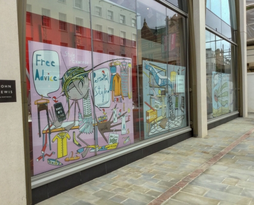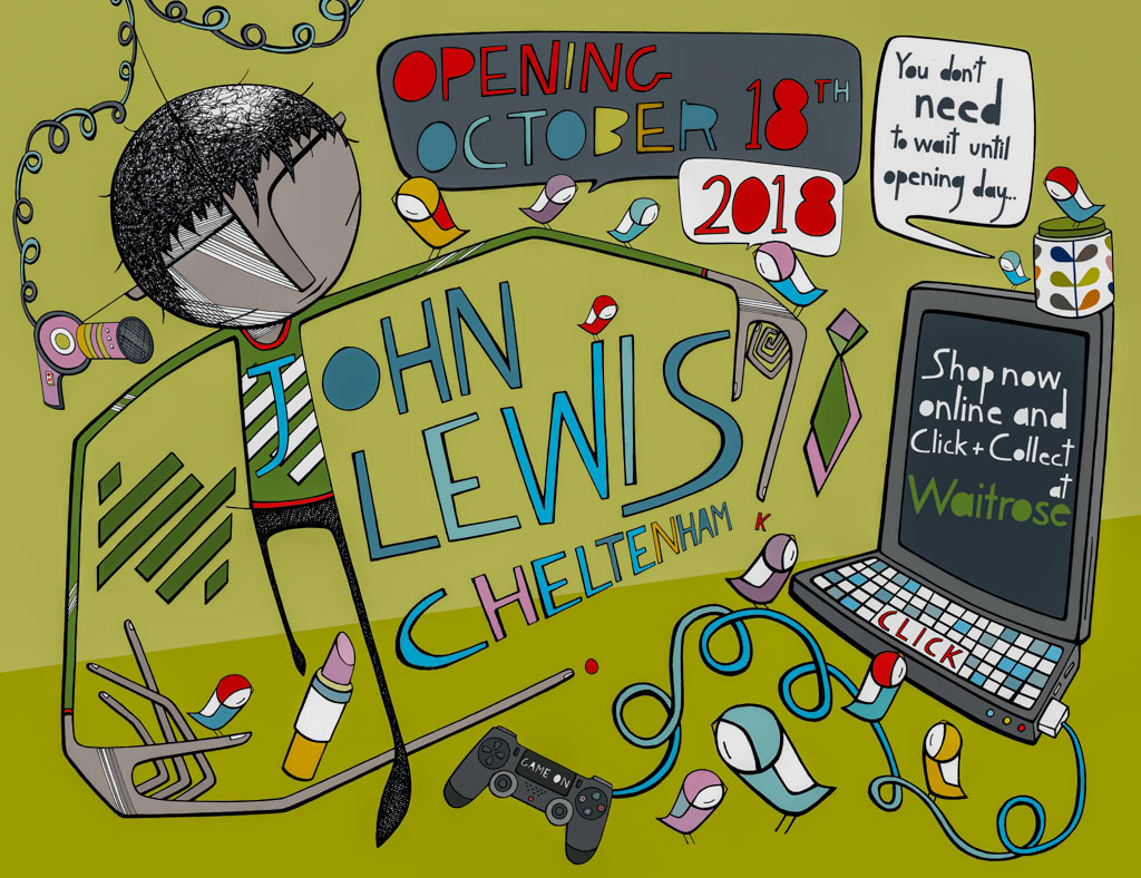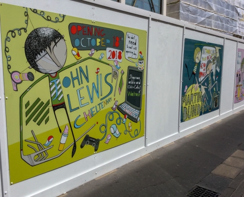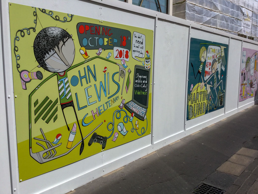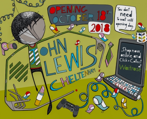 The John Lewis commission was for a series of eye catching, decorative and publicly engaging large illustrative panels to adorn the temporary hoardings protecting the new build store in central Cheltenham. From inception to commission, to print and installation, the turnaround was over a short time period of 4 weeks. The panels proved very successful, with John Lewis management moving them into their store windows once the temporary hoardings came down prior to opening, and then into permanent display in the staff corridors back stage.