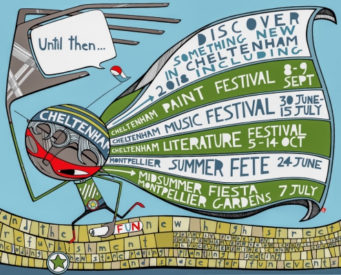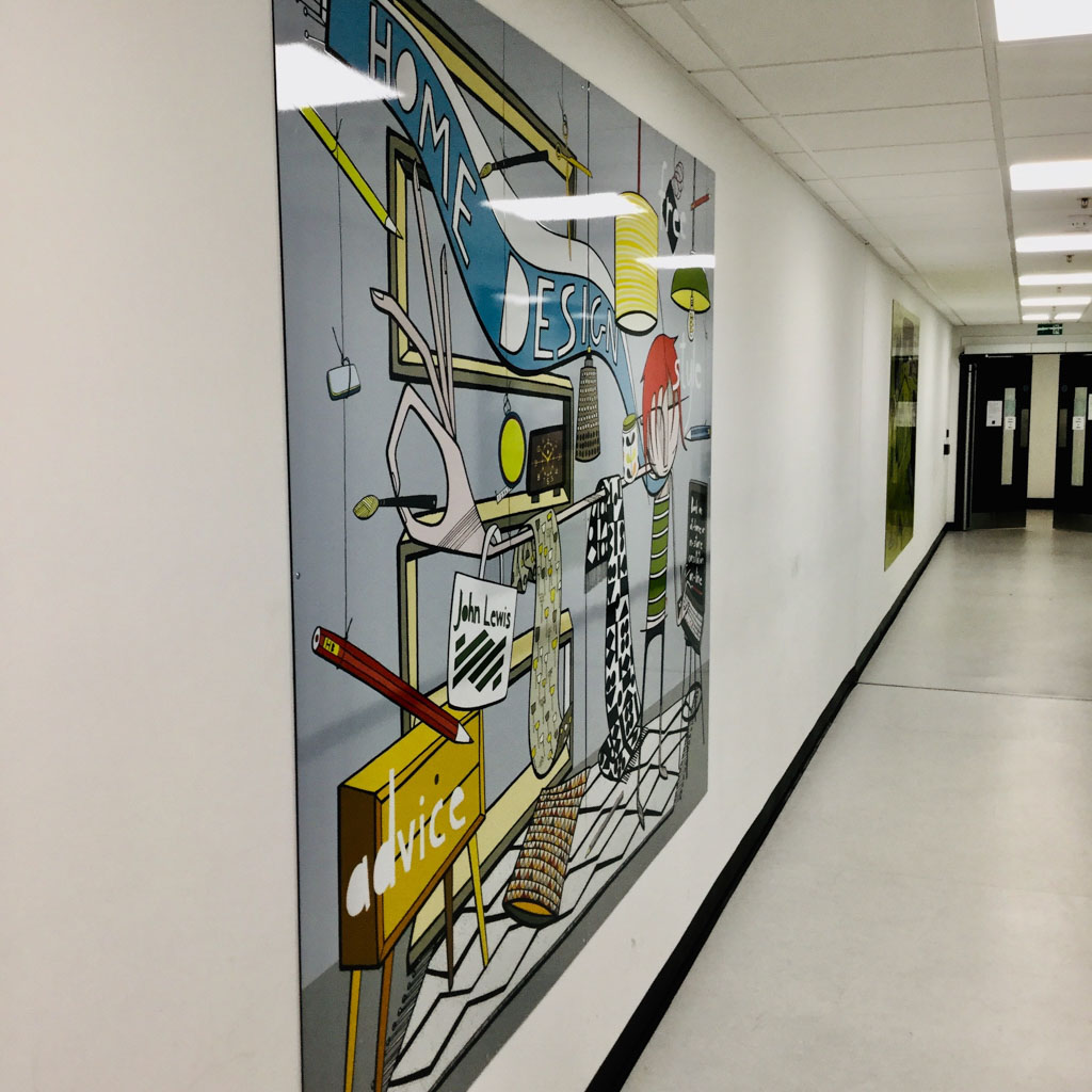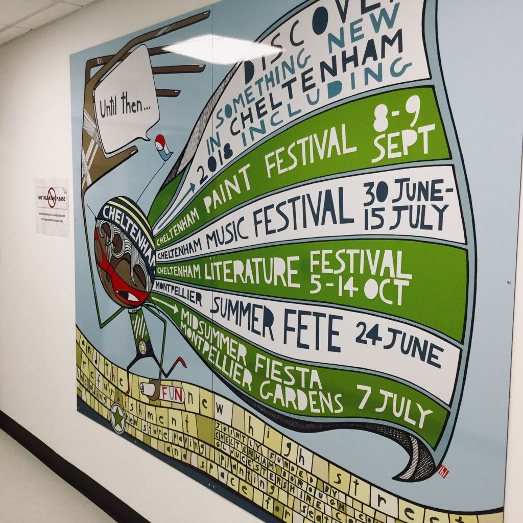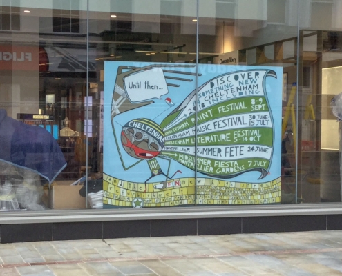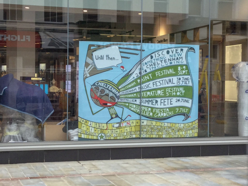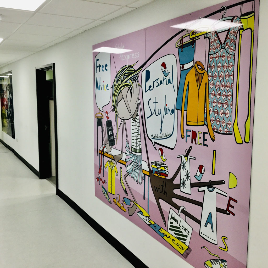 The John Lewis commission was for a series of eye catching, decorative and publicly engaging large illustrative panels to adorn the temporary hoardings protecting the new build store in central Cheltenham. From inception to commission, to print and installation, the turnaround was over a short time period of 4 weeks. The panels proved very successful, with John Lewis management moving them into their store windows once the temporary hoardings came down prior to opening, and then into permanent display in the staff corridors back stage.
