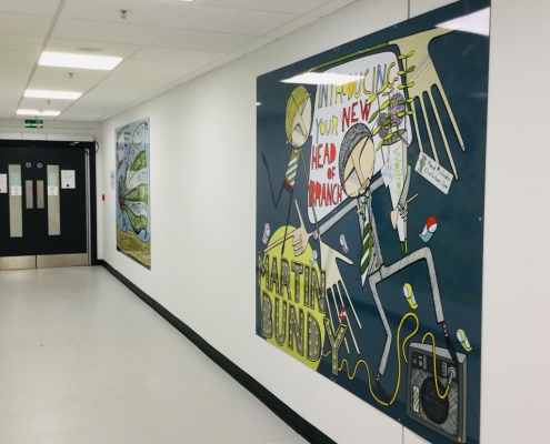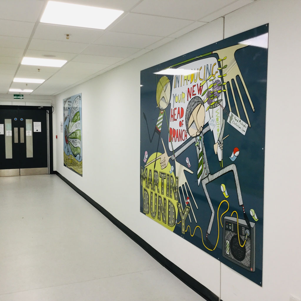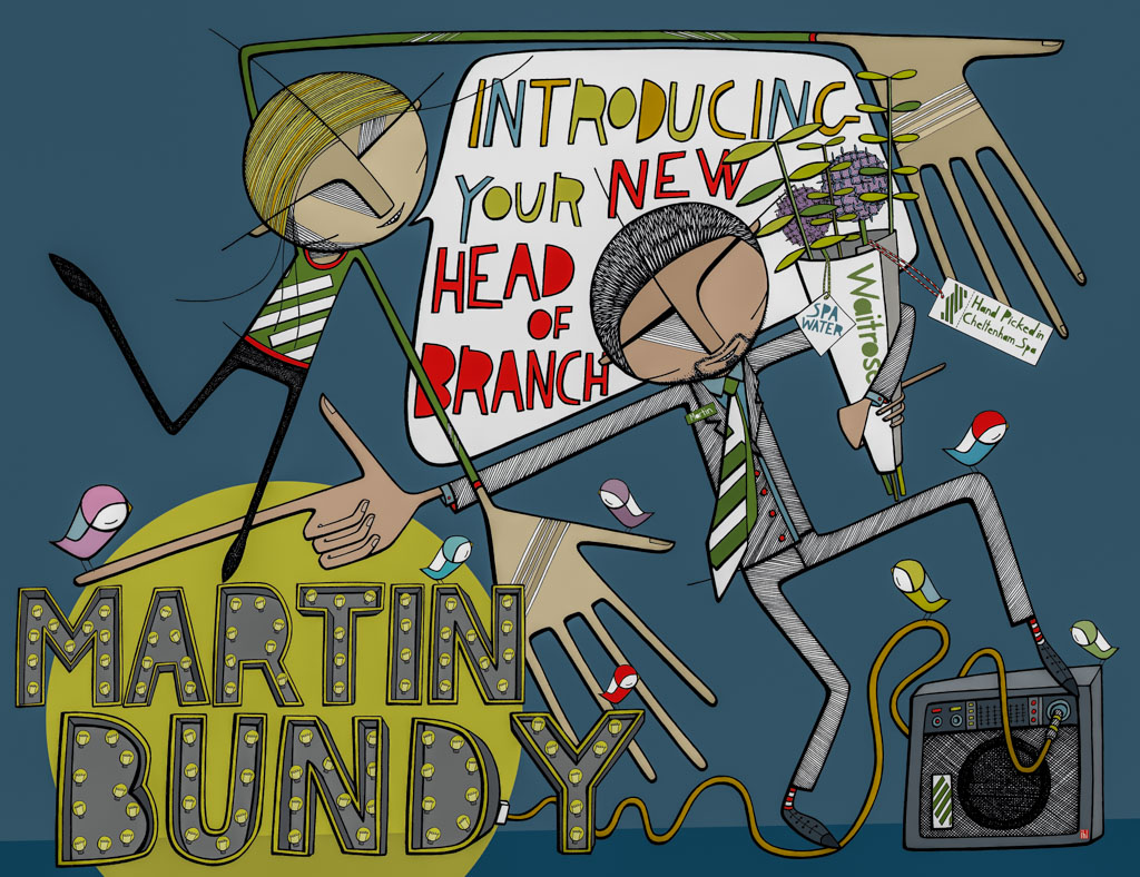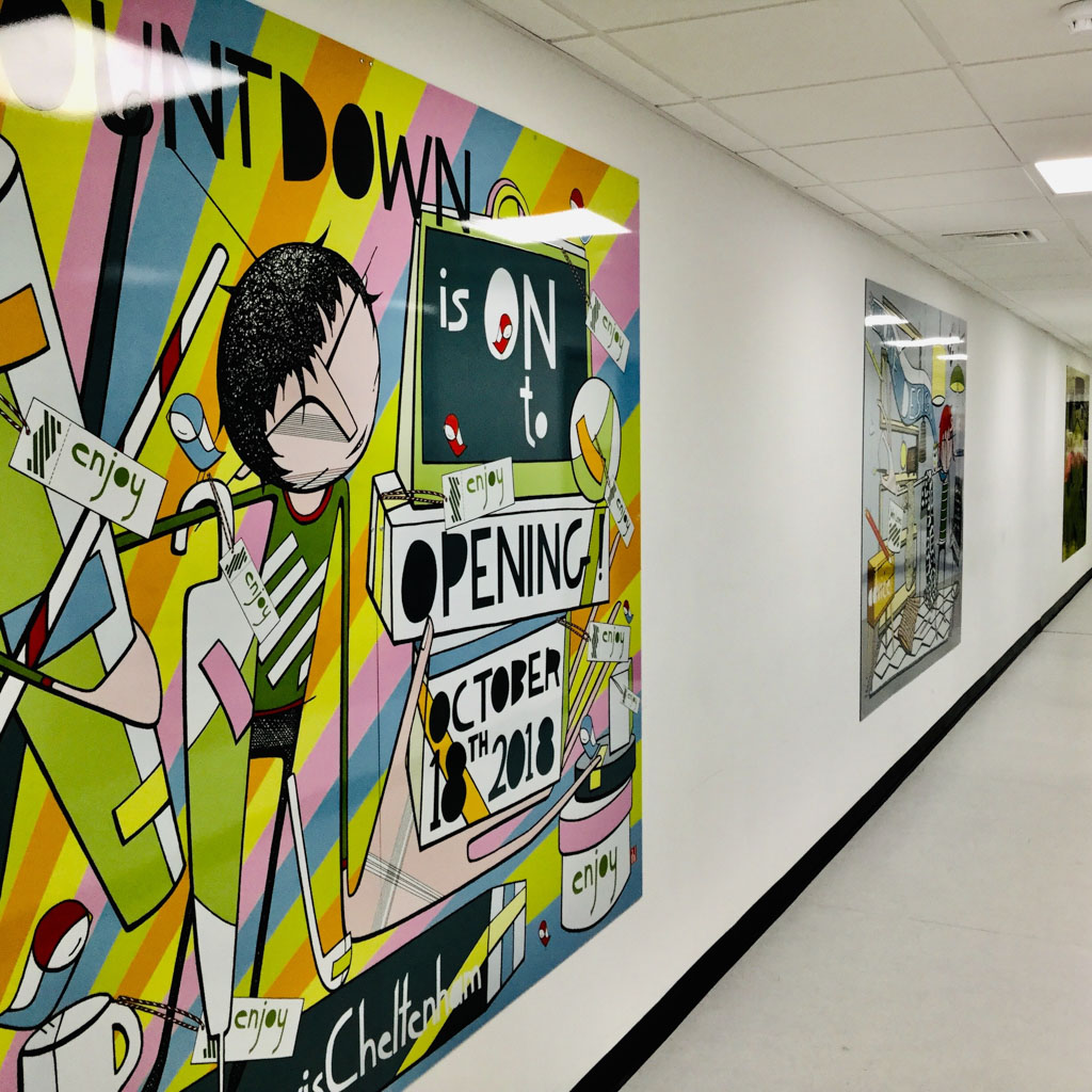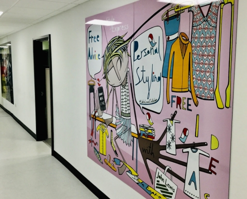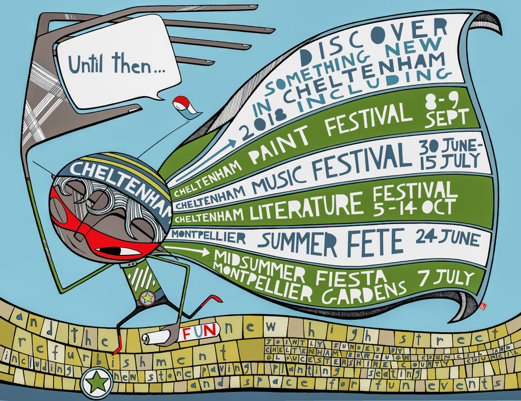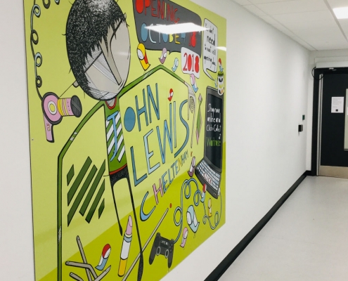 The John Lewis commission was for a series of eye catching, decorative and publicly engaging large illustrative panels to adorn the temporary hoardings protecting the new build store in central Cheltenham. From inception to commission, to print and installation, the turnaround was over a short time period of 4 weeks. The panels proved very successful, with John Lewis management moving them into their store windows once the temporary hoardings came down prior to opening, and then into permanent display in the staff corridors back stage.