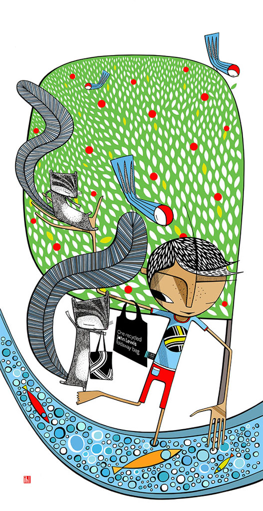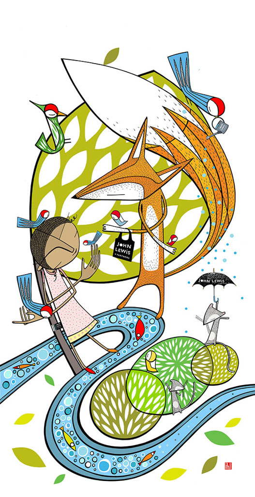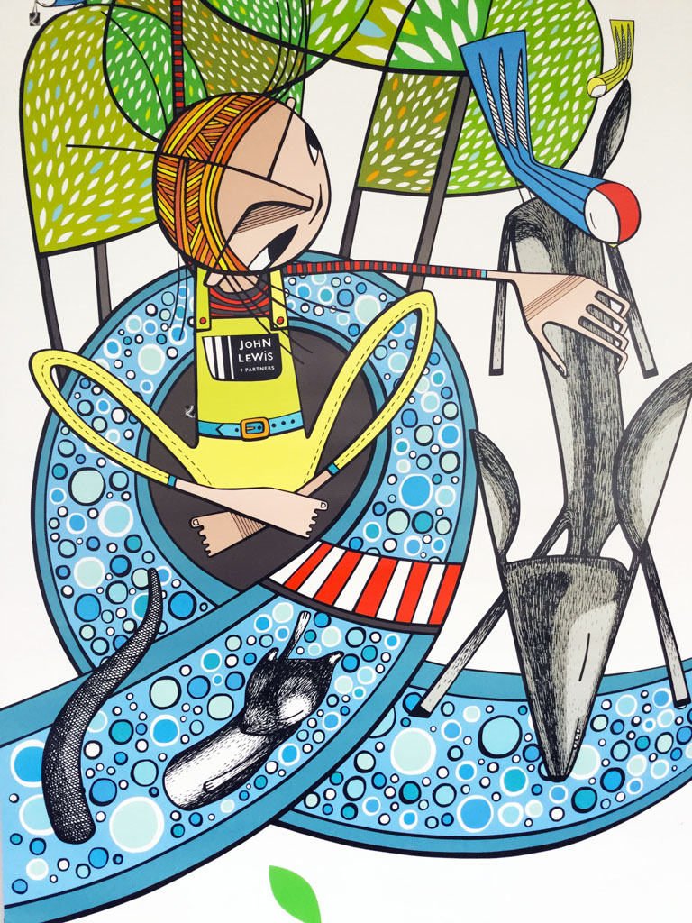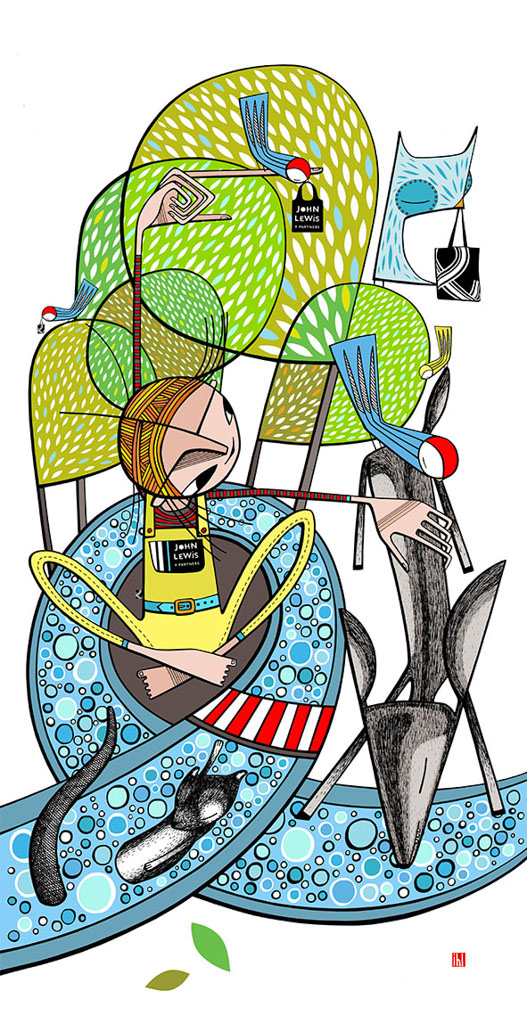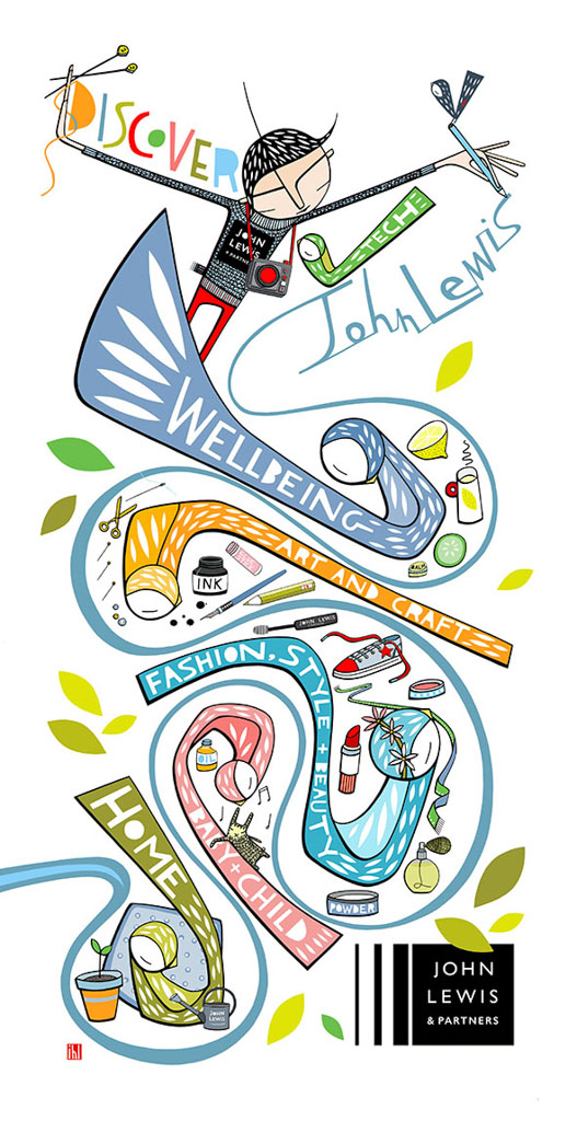 Combining family values, corporate identity, product and plain old good design to create this set of 4 illustrative panels. Each image both stand alone and linked to join the source in the John Lewis name and reprinted to appear in store as postcards and promotion material for their interactive Discovery Room.
