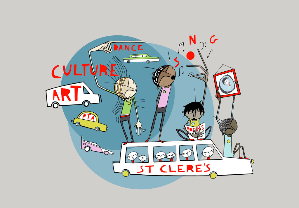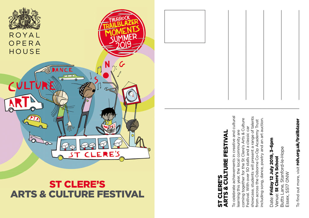 My task was to produce a strong set of graphic illustrations to capture the proposed cultural events to be staged by participating schools within Thurrock, home to High House Production Park – the ROH’s out of town creative hub. Diverse and varied in their range of activities, these uplifting, fun and representative drawings were to work as logo, infographic poster, illustration for publication and postcard. Working closely with London graphic designer Paul Marc-Mitchell, this illustration commission was fast paced and great fun to complete.