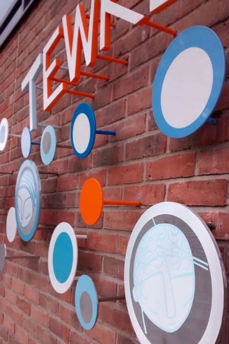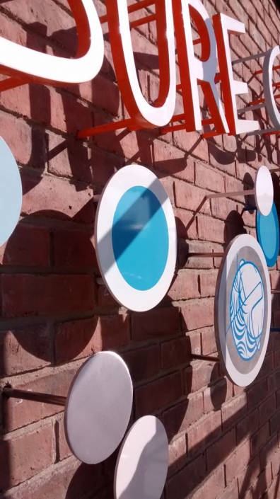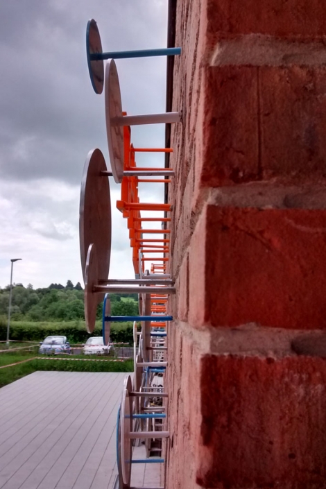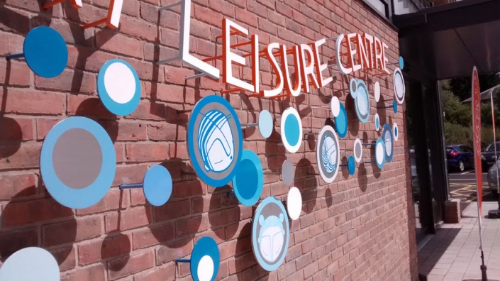 Commissioned by Tewkesbury Borough Council to design and create an eye catching and innovative public art installation to adorn the newbuild Tewkesbury Leisure Centre. The work was to act as a sign post and aesthetic adornment to enhance and resonate with public expectation and necessity.
