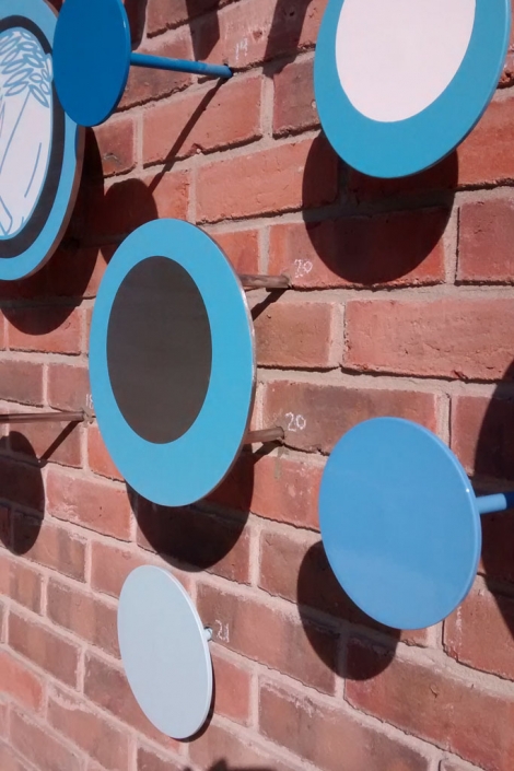 The design resembles a flow of water droplets referencing the local rivers without and the swimming pools within, with swimmers of all ages and genders represented among the stylised ‘water’ disks. Working within the community, a series of community workshops fed my creative input for this significant public art installation.