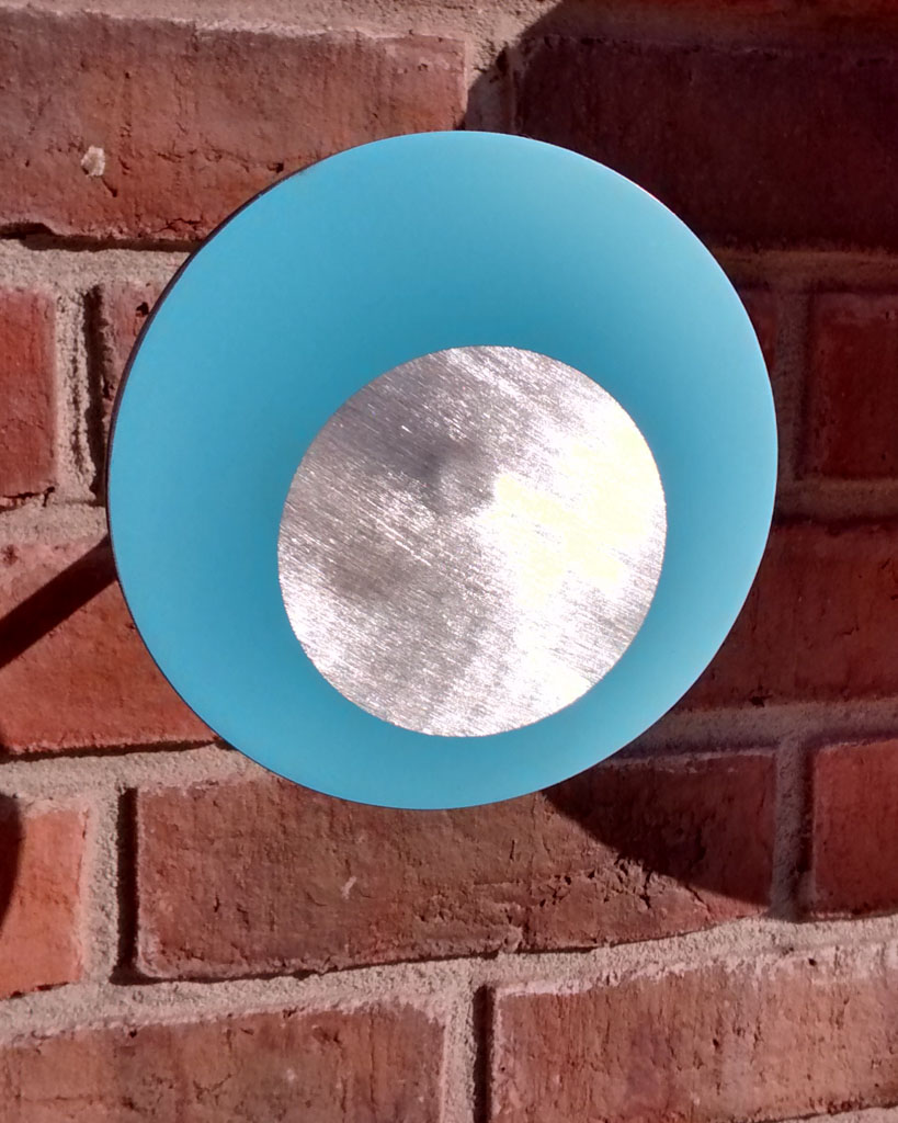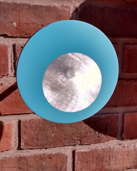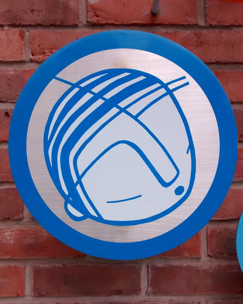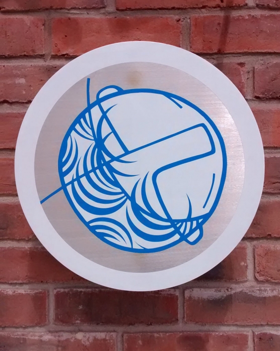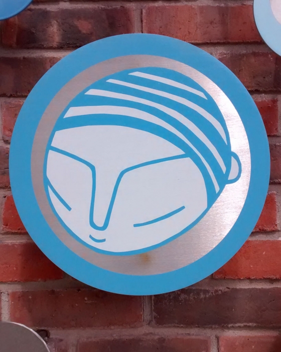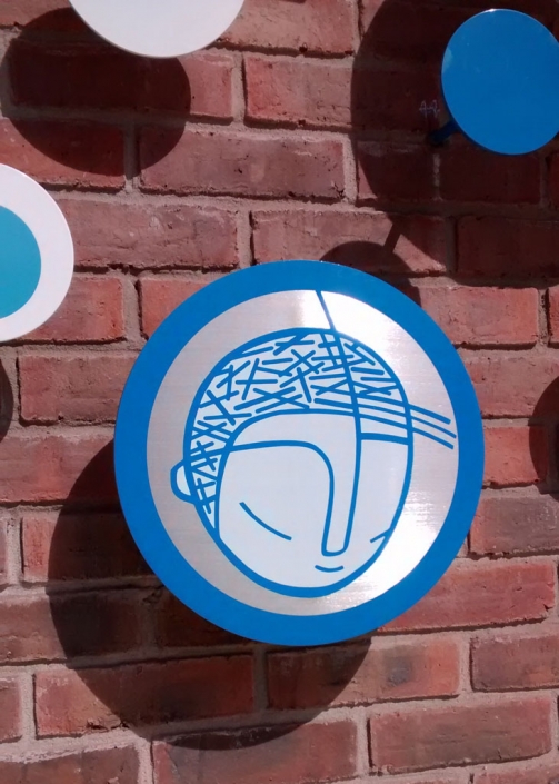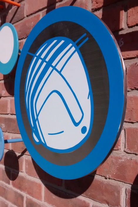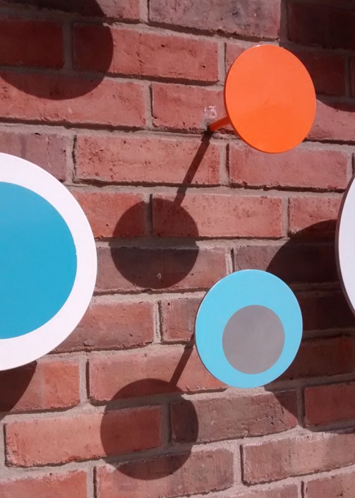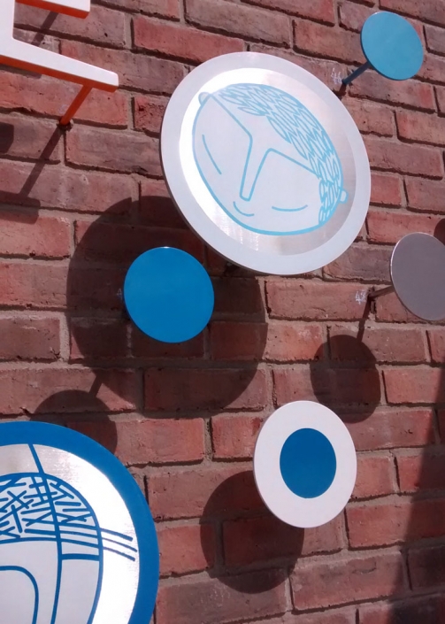 Materials: Stainless steel disks; screen printed details; powder coated letters and coloured disks.
