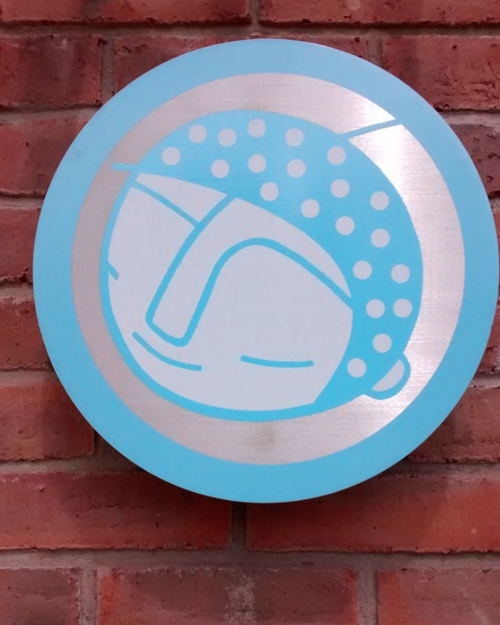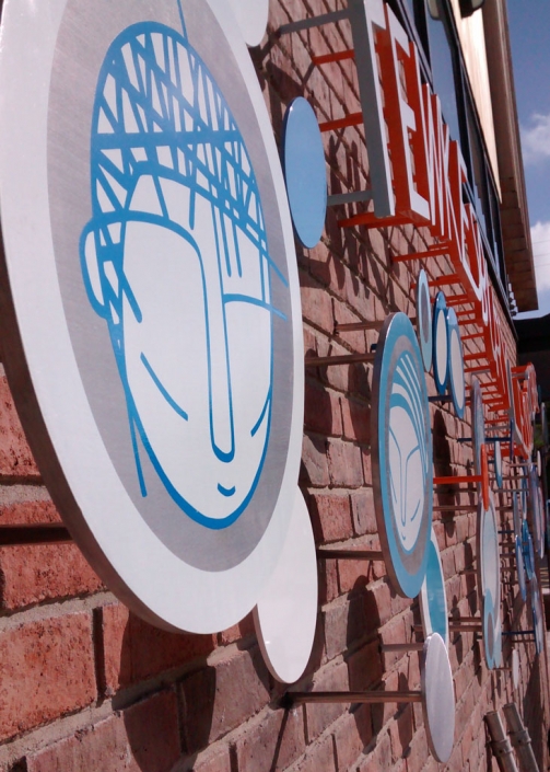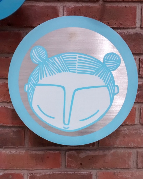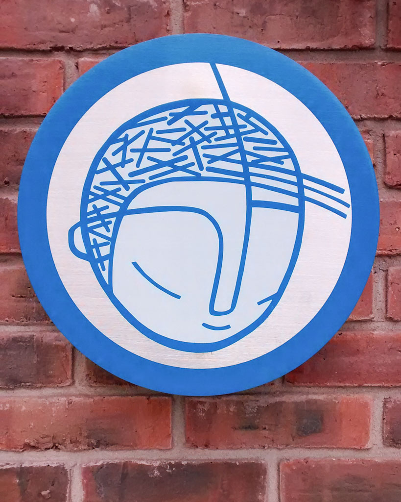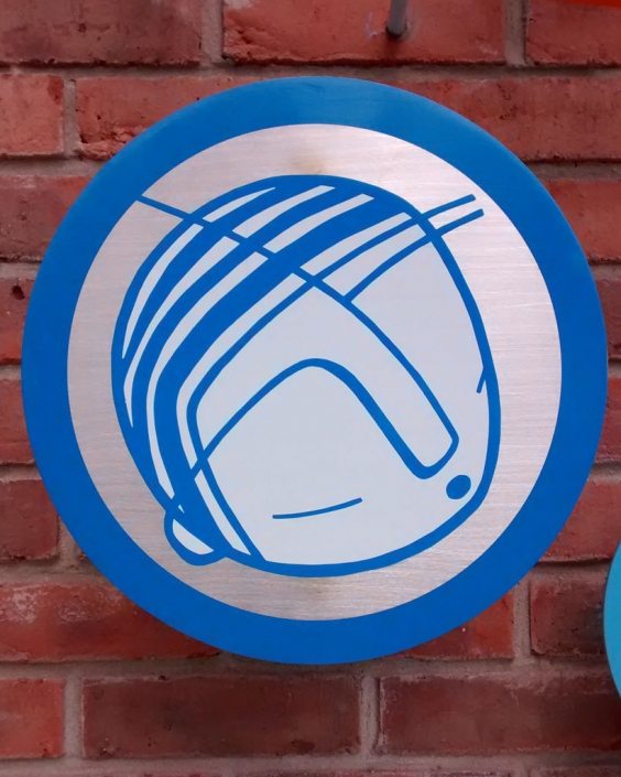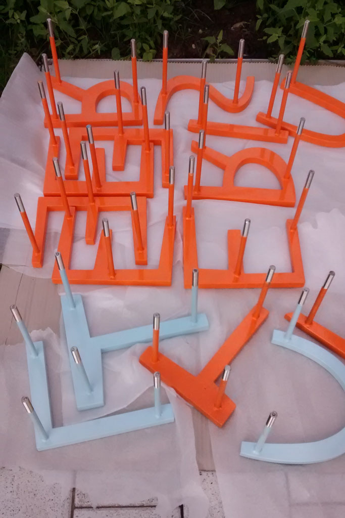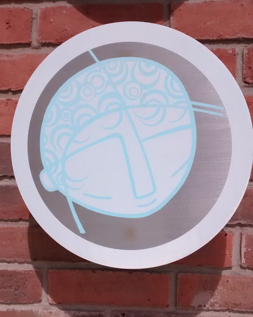 Materials: Stainless steel disks; screen printed details; powder coated letters and coloured disks.