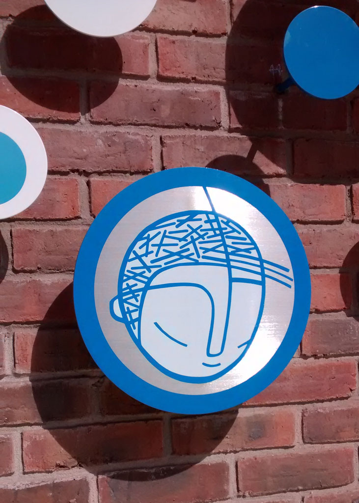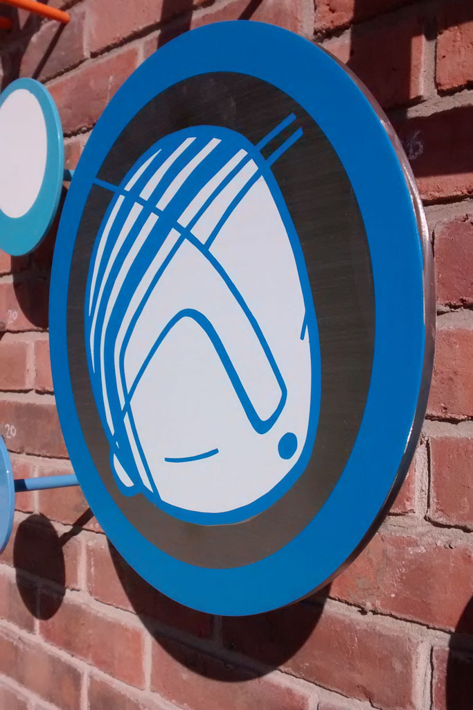 My choice of materials was governed by both aesthetic and practical considerations. To my eyes this art work was to look sharp, clean, clear, precise and colourful. It also needed strength, longevity, no maintenance and to be vandal proof.