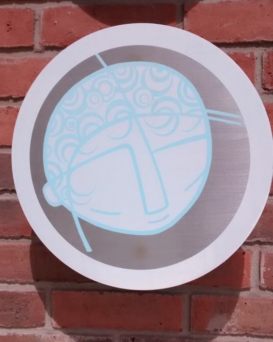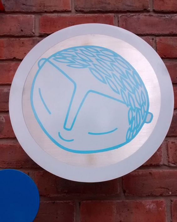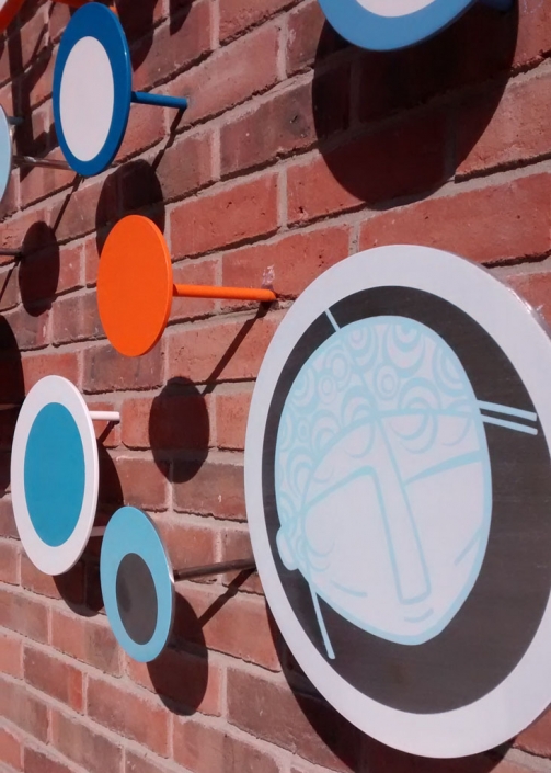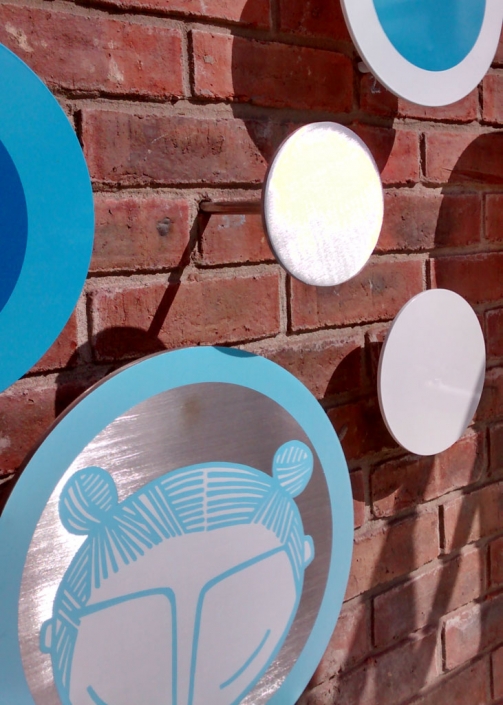 Process: Liaison; concept design; community workshops; final design; conversion into Adobe Illustrator for full technical working scale drawings; steel fabrication; acid etch and screen printed character detail onto brushed steel finish; powder coated 2 tone 3D letters; powder coated coloured disks; full scale printed plan; installation including individually drilled plugs for each disk, accommodating budget and potential replacement of separate elements in case of vandalism.